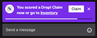 A handy progress bar fills up as time passes, allowing you to track exactly how long you need to watch the livestream in order to get the next Drop. Once the bar is filled, you will get a notification directly in your browser with a button to claim the Drop. The image below shows a notification that the Drop conditions have been fulfilled and a new claim is available: