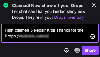 Make sure to claim the Drop within 7 days (168 hours) of the end of the campaign. If you do not take any action, the Drop will disappear 7 days (168 hours) after the campaign ends. When you receive a Drop, you may be prompted to share your claimed Drops in the chat, like in the image below:
