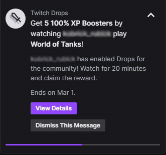 In-game rewards from Drops are automatically credited to the linked Wargaming.net account. If you have claimed but not received a Guaranteed or Mystery Drop after accumulating enough watch time, please log out and then back in to the game. If you still don't see the Drop, try the following steps to fix a potential connection issue:
