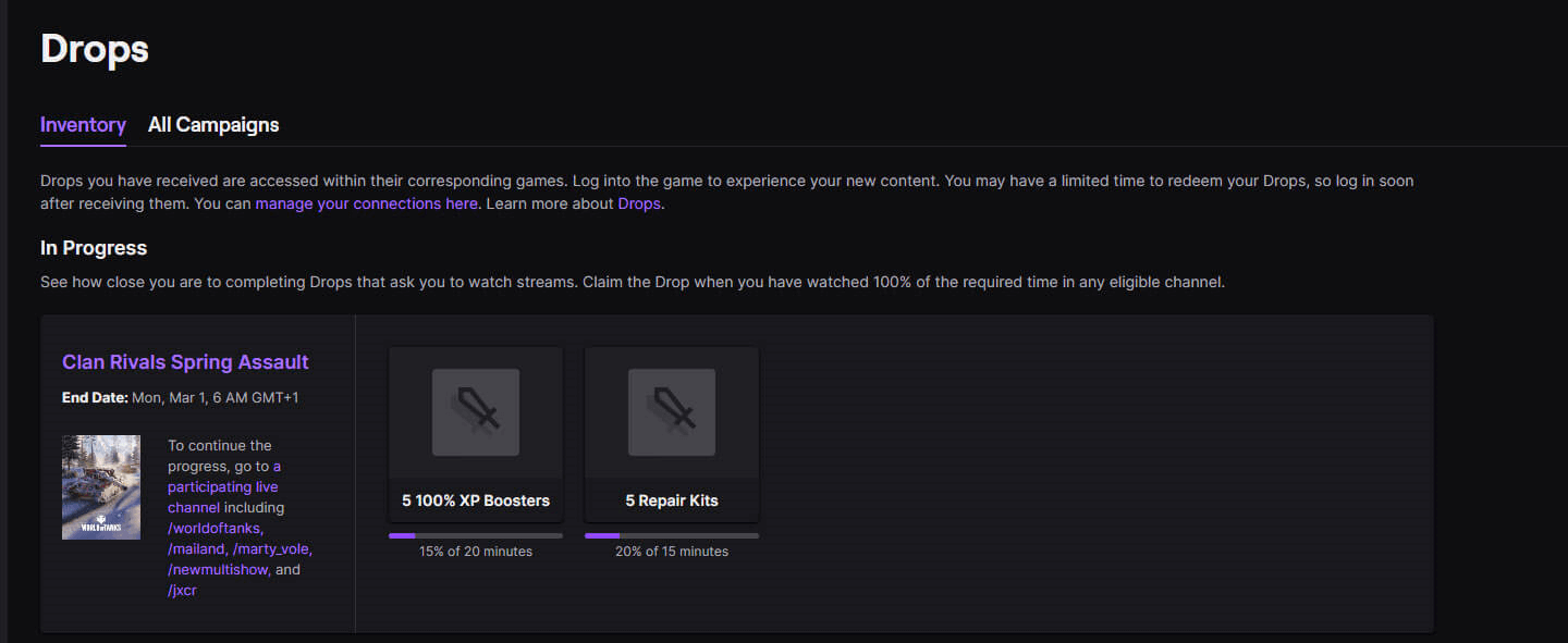 Twitch Drops campaigns are announced on the portal with detailed listings of what rewards are up for grabs and how much watch time is required. You can also see the currently active Drops campaigns in the All Campaigns overview on the Twitch website.