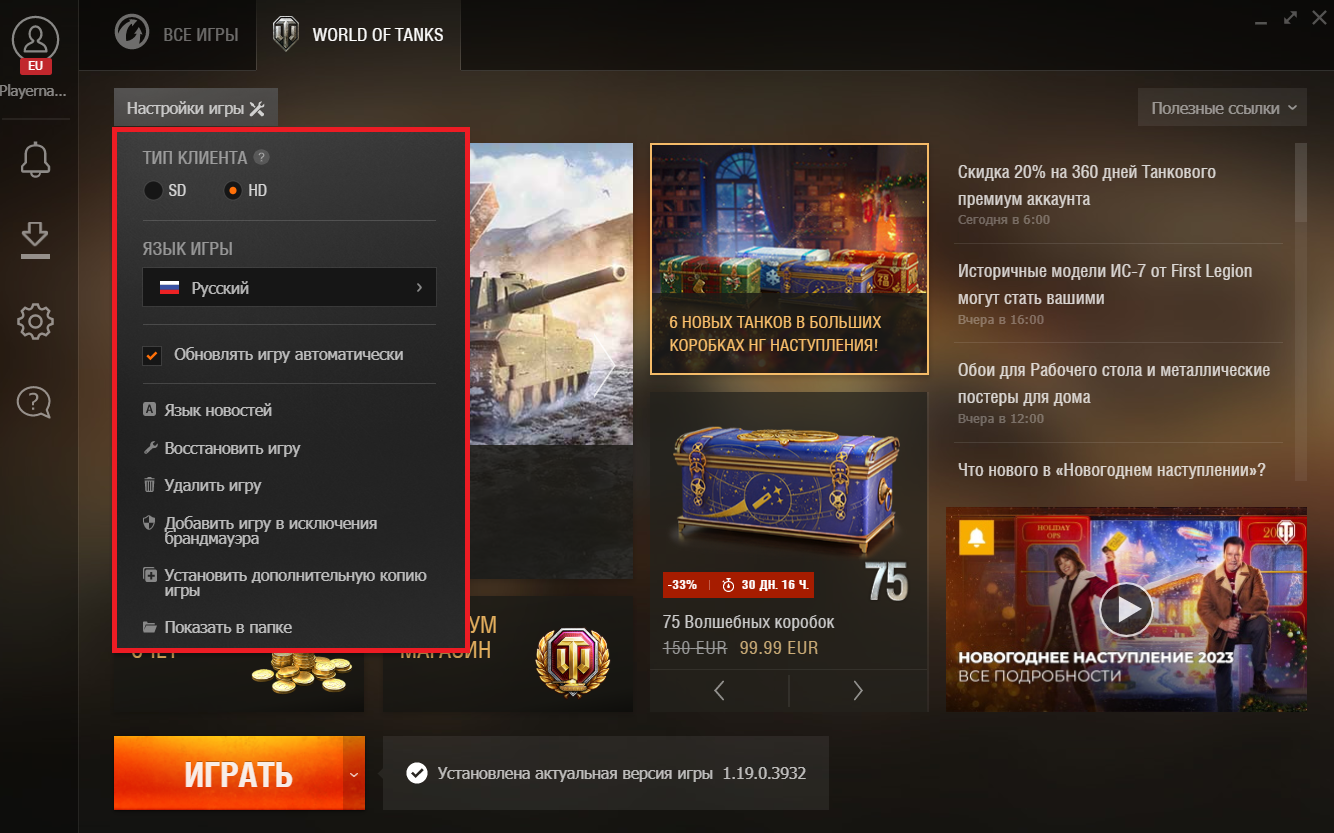 В Wargaming.net Game Center вы можете поменять некоторые настройки игры, например язык или тип клиента: перейдите на вкладку игры и нажмите Настройки игры в левой верхней части окна. В этом же меню настроек вы можете изменить язык новостей для выбранной игры.